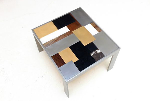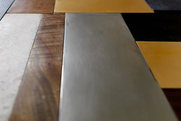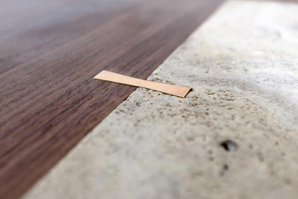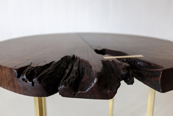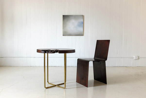 Furnishings in the Materiality collection celebrate the inherent imperfections of such woods as bleached and charred oak, bleached maple, and walnut, cast bronze, brass, corten steel, marble, and tumbled limestone and the unsettling of objects that emerges from the juxtaposition of these materials. Committed to clean lines, Metzger avoids unnecessary adornment and elements. His work embodies a quiet yet dramatic presence and speaks of the strength of such enduring influences as George Nakashima and Danish design, but is distinguished by his modern interpretation of understated beauty, combined materials, and reverence for nature. Based in southwestern Ohio and working with limited machinery, Metzger sources woods from Amish millers, fashions his metals in local foundries, and develops his own acid patinas, bleaches, and charring techniques. Inspired by wood’s integrity and unpredictability, he enjoys the creative and technical challenges of figured woods with their natural variants and patterns. Rescued at the right moment, the wood remains sound but marked by natural processes. “It’s about having respect for the wood, attunement to timing, and knowing when and how to work it,” says Metzger. “Of course it’s more complicated than that; there’s poetry to the process of calling out its inherent beauty.” The surface of a maple and cast bronze side table, made from spalted maple hand-bleached over 20 times, draws its particular and unpredictable beauty from black streaks throughout the wood formed by partial decay, or spalting, the activity of bacteria in the wood. A single red brass butterfly affixed over a natural knot and the cast bronze base create unlikely context. The wood is finished with hand-rubbed waxes.